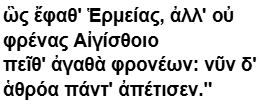 ὣς(= ὡς, 그렇게) ἔφαθ᾽(= ἔφατο, 말하였다) Ἑρμείας(헤르메스가), ἀλλ᾽(그러나) οὐ(아니다) φρένας(마음을) Αἰγίσθοιο(아이기스토스의) πεῖθ᾽(= πεῖθε, 설득하였다, 미완료 3단) ἀγαθὰ(좋은 것들) φρονέων(호의적인): νῦν δ᾽ ἁθρόα(통채로, 완전한, 여성 단수) πάντ᾽(= πάντα, 모든 것) ἀπέτισεν(지불하였다, 무정 3단).