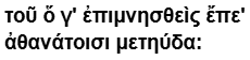 τοῦ(그에 관하여) ὅ(그는) γ'(= γε, 적어도) ἐπιμνησθεὶς(+ 속격, 떠올리며, 무정분사) ἔπε'(=ἔπεα, 말들을, 동족목적어, 중성 대격 복수) ἀθανάτοισι(신들에게) μετηύδᾱ(메떼-우다- = μετηύδαε, 말하였다, 미완료 능동 3단):