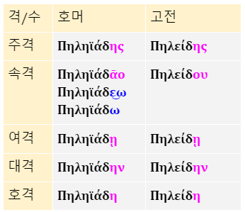 ㅇ 아래 호머 그리스어 변화와 비교해 볼 것
