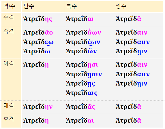 ㅇ 표준형 : Ἀτρείδης, Ἀτρείδου, ὁ, 아트레우스의 아들, 아가멤논(고전그리스어)