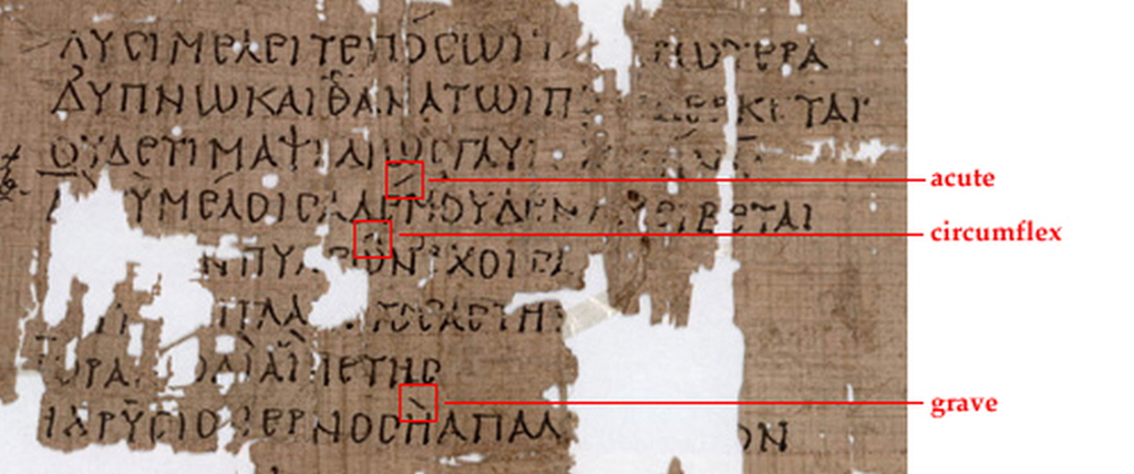 * 고대 그리스어는 4가지의 성조와 3가지의 액센트 부호를 가지고 있다. 액센트는 숨표 뒤(상강세, 하강세) 또는 위(곡강세)에 표시한다. 그리고 이중모음에 액센트를 표시할 때에는 뒤에 오는 모음 위에 표시한다.